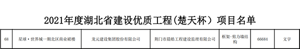 近日,龍元建設湖北分公司承建的荊門·星球世界城一期項目獲得2020-2021年度湖北省建筑行業工程質量的最高榮譽獎——楚天杯。