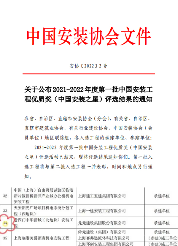 20221 7 日,中國安裝協會發布《關于公布2021-2022年度第一批中國安裝工程優質獎(中國安裝之星)評選結果的通知》,龍元集團承建的老西門中華新城(北地塊)安裝工程榮獲“中國安裝之星”。